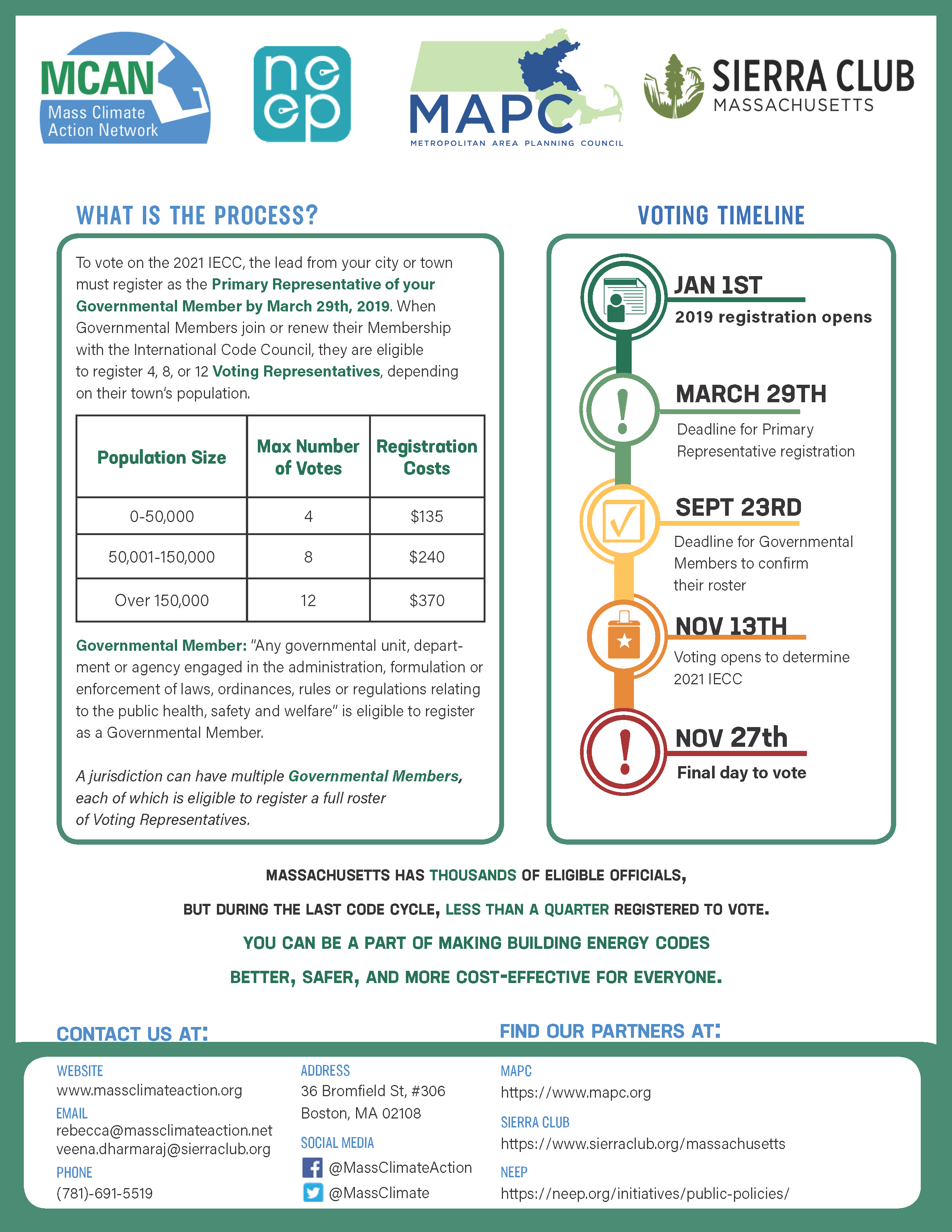 This flier was created to inform individuals about registering for the 2019 vote on the International Energy Conversation Code. I planned the document’s composition and layout, conducted photo research, selected the typography, as well as designed the “Voting Timeline” infographic.